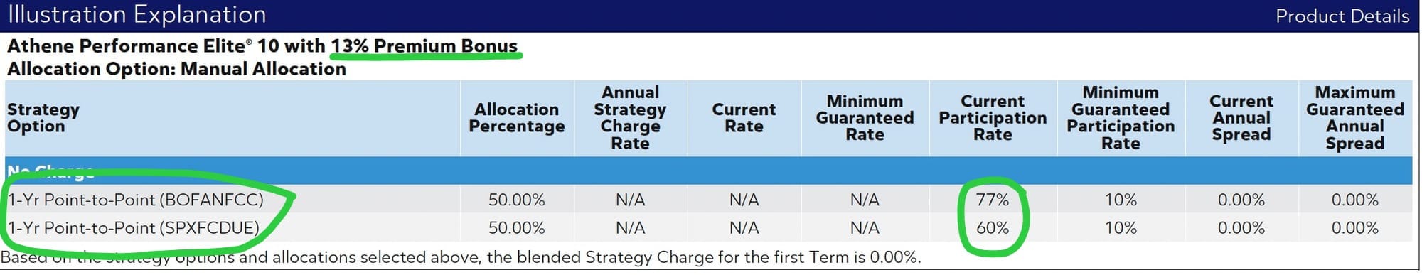 This product offers 13% bonus. That means your $200k starts with $226k. The chosen allocation is 50 percent in the BOFANFCC Index and 50 percent in the SPXFCDUE Index. If the BOFANFCC Index earns 10 percent in a year, 77 percent of it, or 7.7 percent, is credited to your account. If the SPXFCDUE Index earns 10 percent, 60 percent of it, or 6 percent, is credited. If the market performs poorly and the indexes show a 10 percent loss, you get zero credited, but you take no losses.