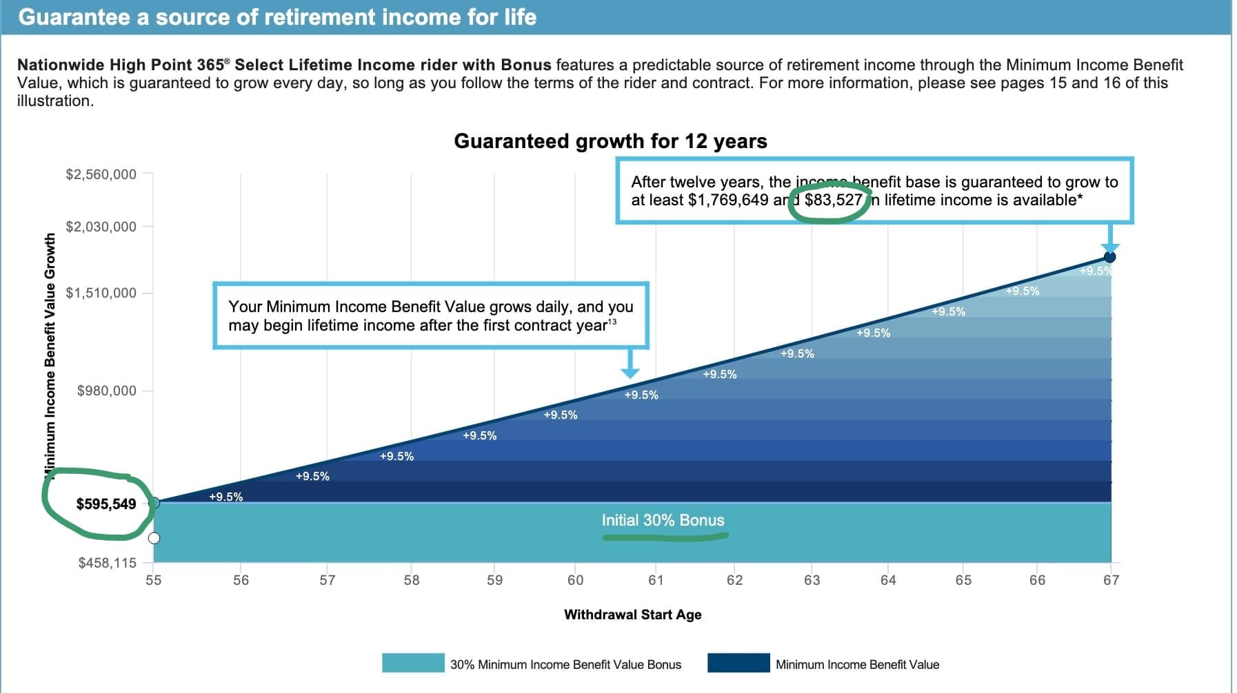 Now, at age 55, you move this $458,115 into an income annuity. Let us see how the Nationwide New Heights Select 9 Fixed Indexed Annuity with the High Point 365 Select Lifetime Income Rider and bonus performs.