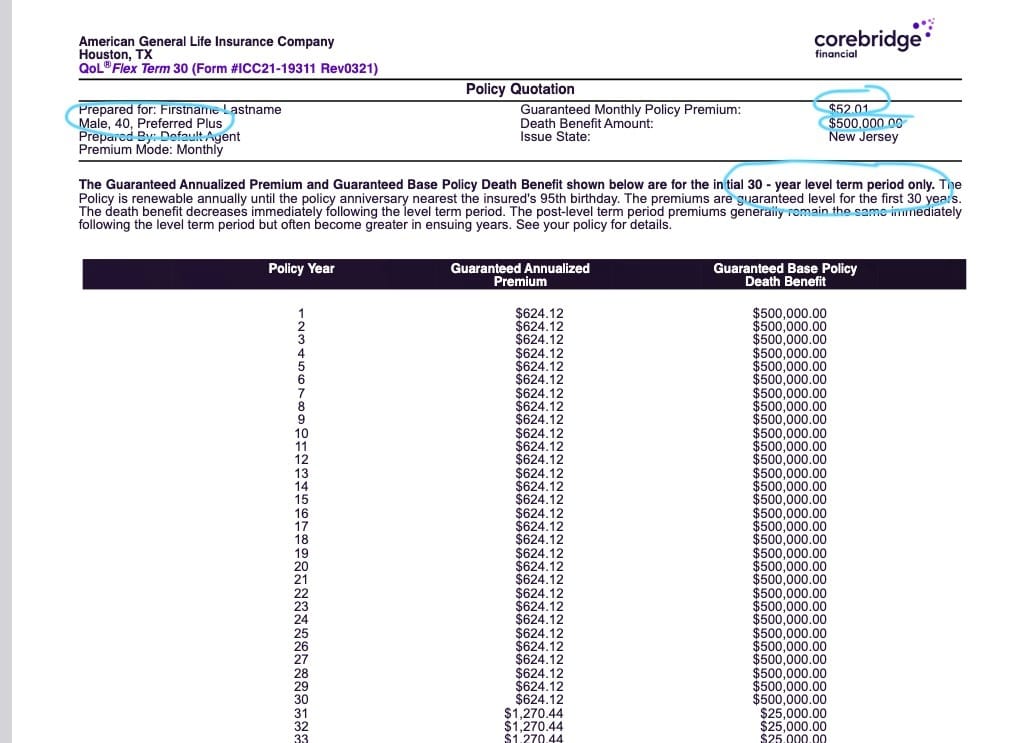 A quote from AIG Corebridge, one of the leading providers of term life insurance, shows a cost of $52 per month. This policy includes the Accelerated Death Benefit rider, which provides living benefits for chronic, critical, and terminal illness.